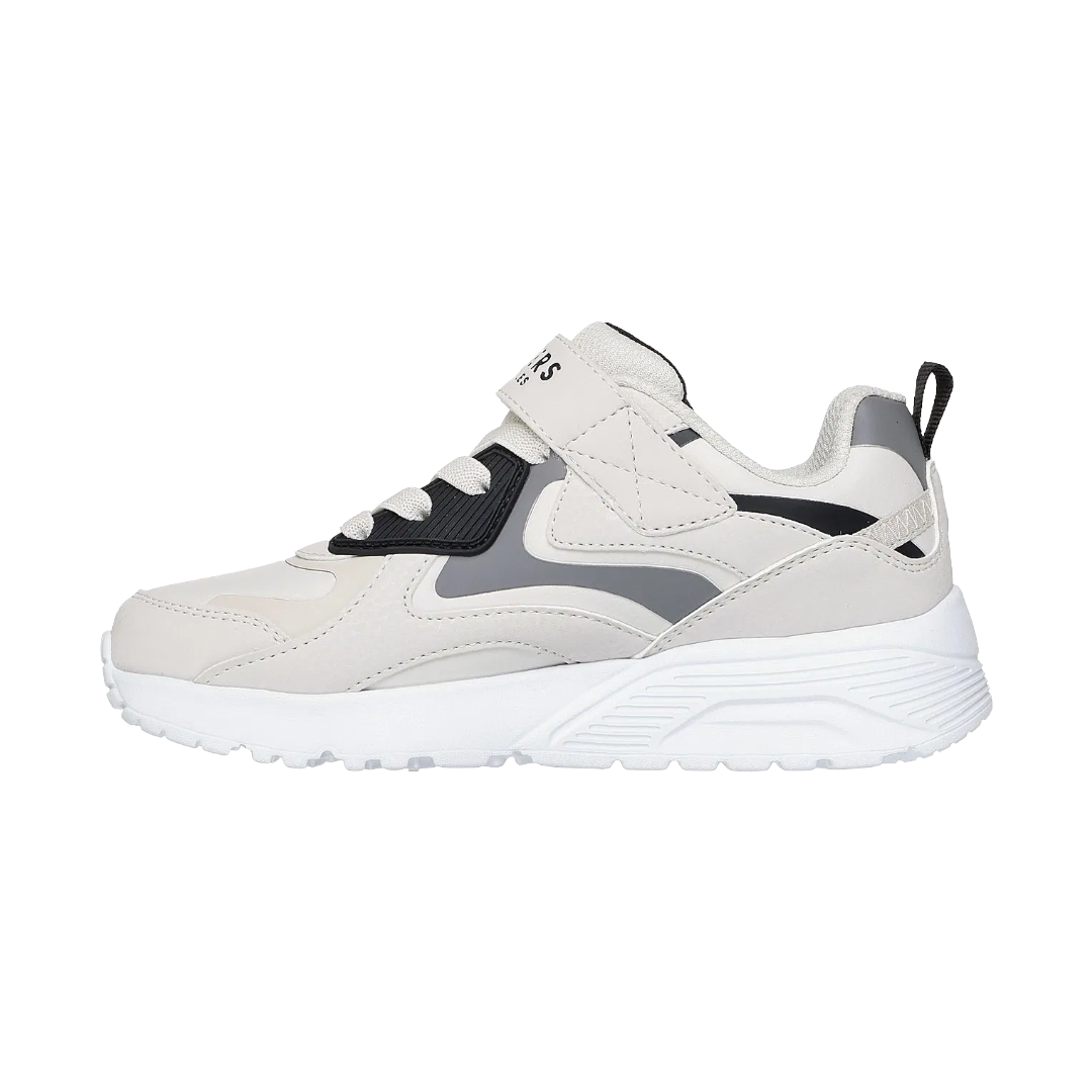 Las Skechers Uno Lite Chroma infantil combinan estilo moderno con la comodidad que los niños necesitan en su rutina diaria. Su diseño en tonos claros con detalles coloridos destaca por un look fresco y versátil, fácil de combinar en cualquier ocasión. La capellada en material sintético con acabados suaves brinda resistencia y ligereza, mientras que la media suela con cámara de aire visible entrega una pisada amortiguada y estable. La suela de goma flexible asegura tracción en diferentes superficies, adaptándose tanto a actividades al aire libre como al uso cotidiano. Su plantilla con memoria se ajusta al pie para un confort prolongado, y el interior acolchado proporciona una sensación de suavidad en cada paso.